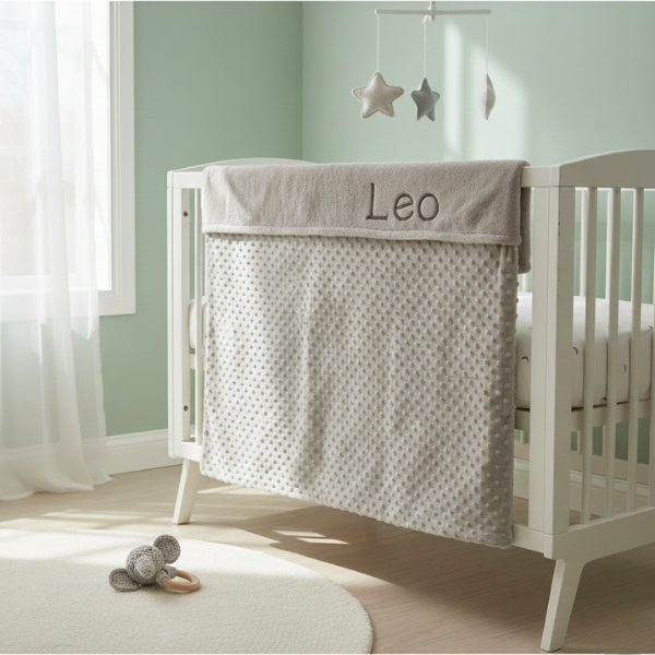 This unique crib blanket with a personalized name is perfect for your little one and offers a soft, luxurious feel. Made from high-quality minky fleece and coral fleece, the blanket delivers ultimate softness and warmth. Ideal for the crib, toddler bed, or stroller, with a special embroidered edge at the top.